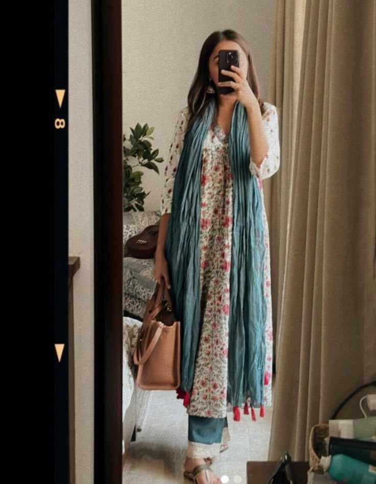 She slipped into a soft cream-colored kurti with delicate floral threadwork all over, a little deep V neckline, paired with a matching dupatta. A tiny black bindi sat between her brows, and kajal lined her tired eyes. She wore small silver jhumkas, just enough to remind herself she still loved looking good—even if she didn’t feel it.